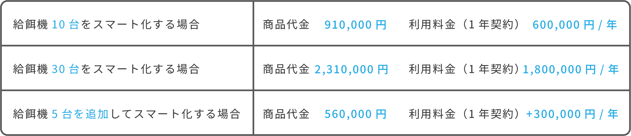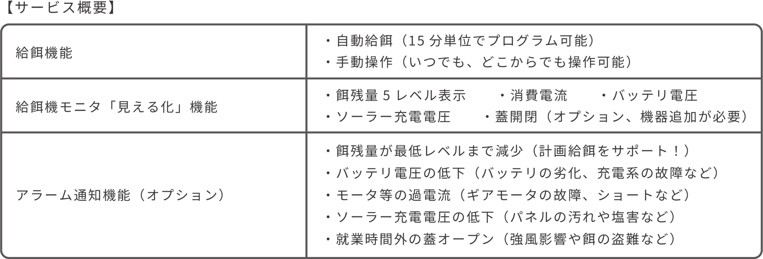 ・給餌機内の餌残量を常に把握 ⇒繁忙時に陥りがちな餌が空の状態を回避・バッテリあがりや餌詰まりをタイムリにキャッチ ⇒計画通りに給餌できていない状態を撲滅